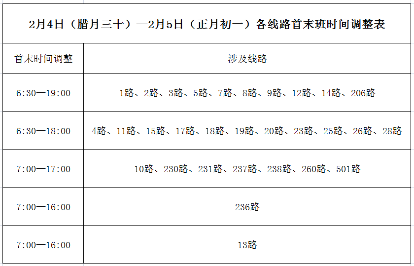 (一)2月4日、5日(三十、初一)首班延后發(fā)車、末班提前收車,具體明細(xì)見(jiàn)下表: